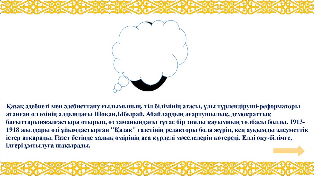 бағыттарынжалғастыра отырып, өз заманындағы тұтас бір зиялы қауымның төлбасы болды. 19131918 жылдары өзі ұйымдастырған "Қазақ" газетінің редакторы бола жүріп, кең ауқымды әлеуметтік