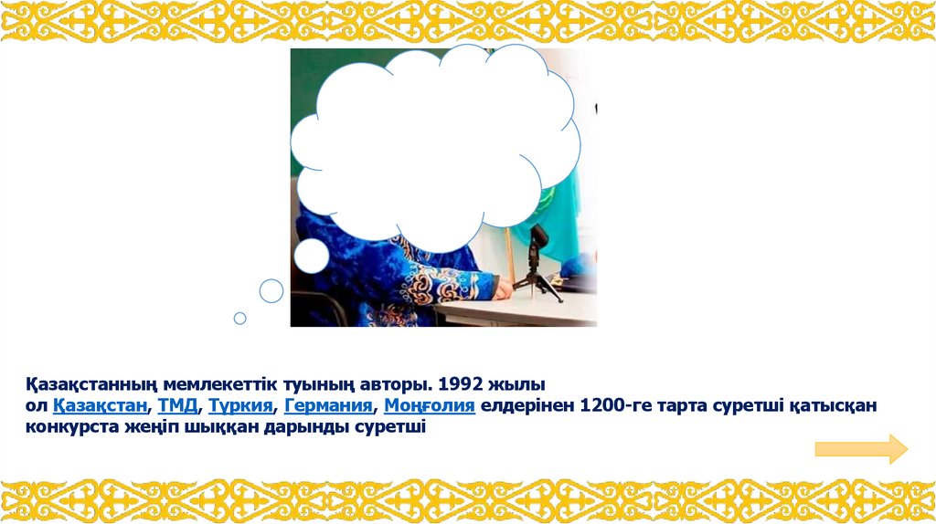 Қазақстанның мемлекеттік туының авторы. 1992 жылыол Қазақстан, ТМД, Түркия, Германия, Моңғолия елдерінен 1200-ге тарта суретші қатысқан