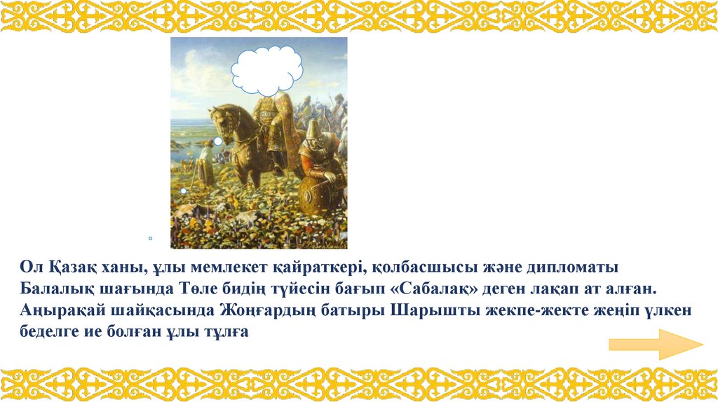 Ол Қазақ ханы, ұлы мемлекет қайраткері, қолбасшысы және дипломатыБалалық шағында Төле бидің түйесін бағып «Сабалақ» деген лақап ат алған.