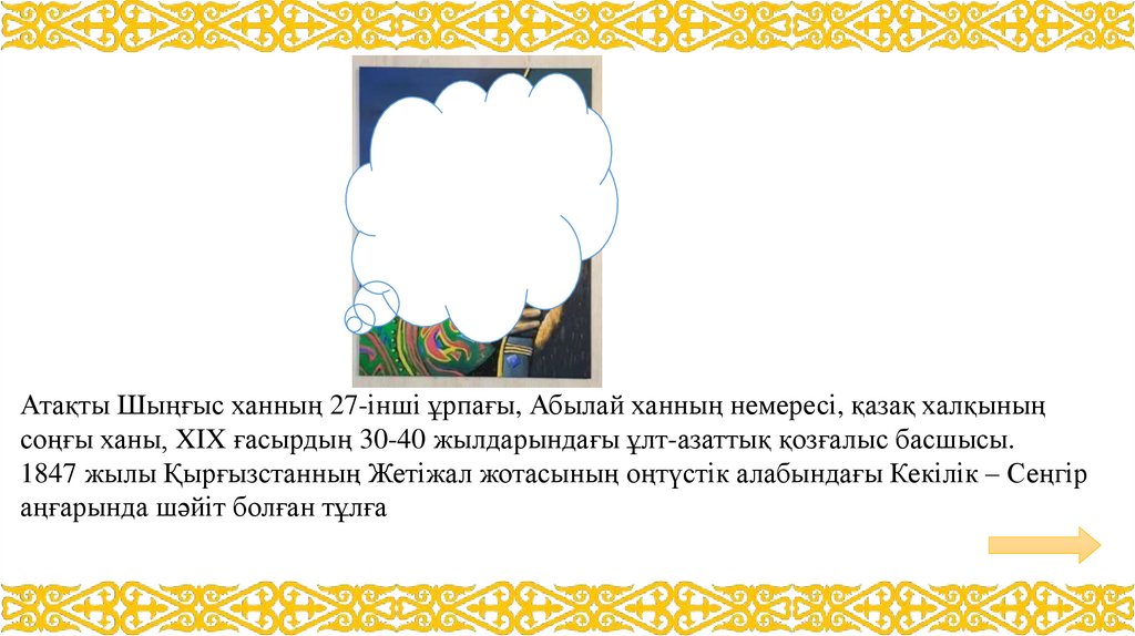 Атақты Шыңғыс ханның 27-інші ұрпағы, Абылай ханның немересі, қазақ халқыныңсоңғы ханы, XIX ғасырдың 30-40 жылдарындағы ұлт-азаттық қозғалыс басшысы.