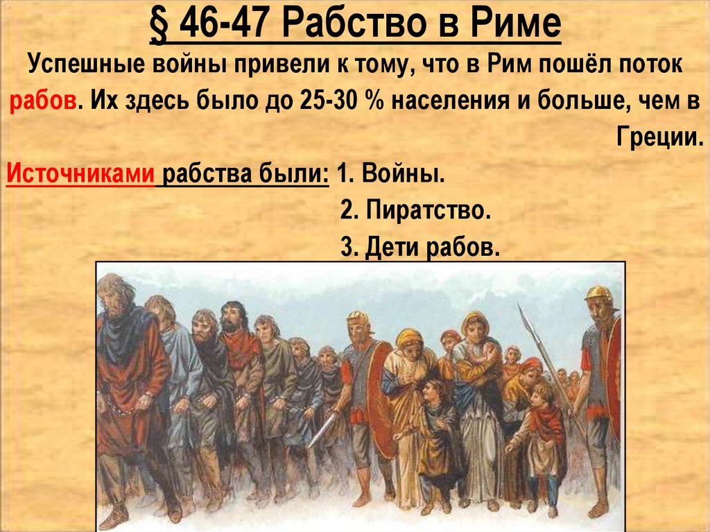 § 46-47 Рабство в РимеУспешные войны привели к тому, что в Рим пошёл поток