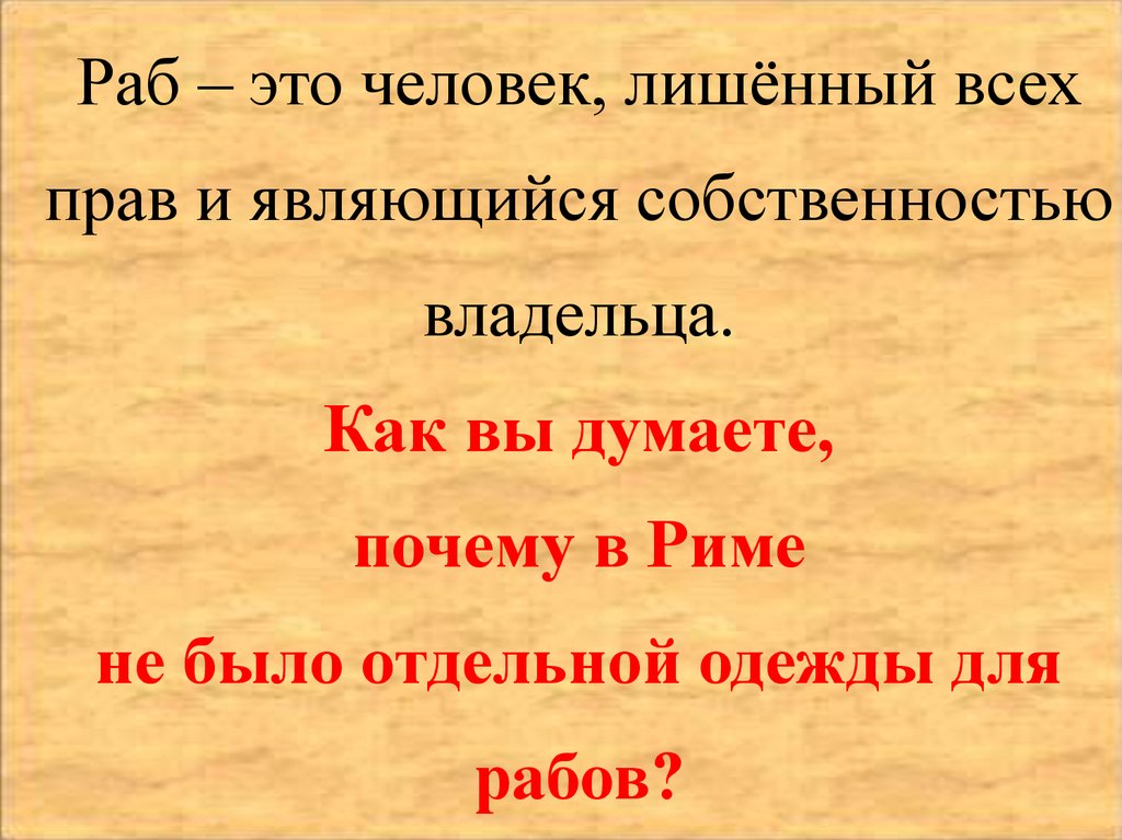 Римляне боялись, что рабы, одетые в специальную одежду,поймут как их много. У богачей могло быть сотни рабов. Но