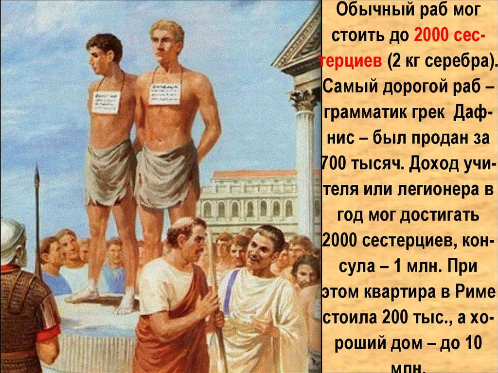 Обычный раб могстоить до 2000 сестерциев (2 кг серебра).