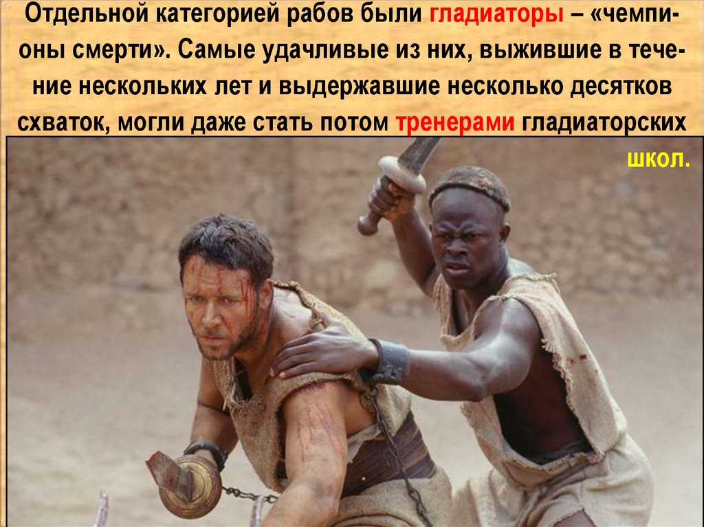 Отдельной категорией рабов были гладиаторы – «чемпионы смерти». Самые удачливые из них, выжившие в течение нескольких лет и выдержавшие несколько десятковсхваток, могли даже стать потом тренерами гладиаторских