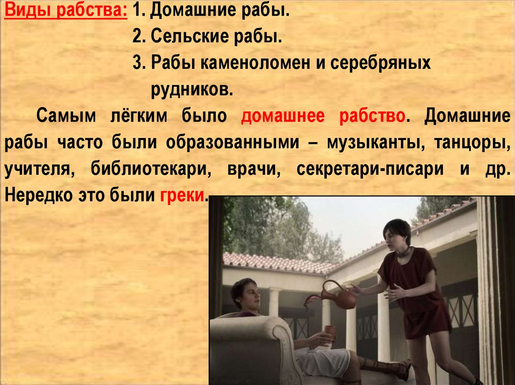 Виды рабства: 1. Домашние рабы.2. Сельские рабы.