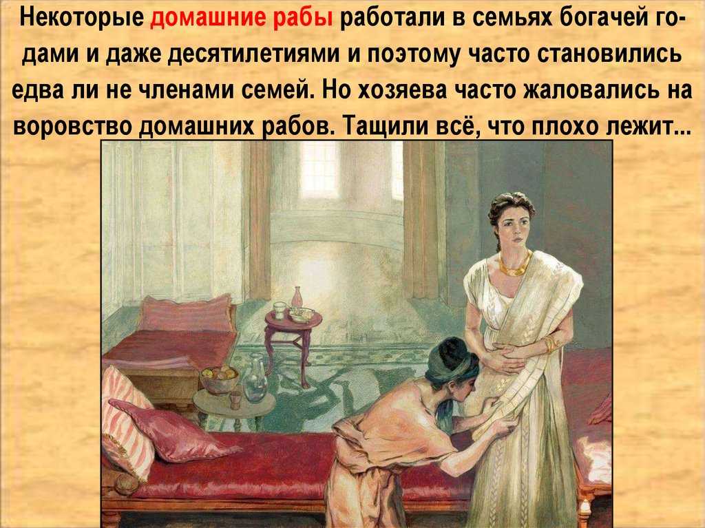 Некоторые домашние рабы работали в семьях богачей годами и даже десятилетиями и поэтому часто становилисьедва ли не членами семей. Но хозяева часто жаловались на