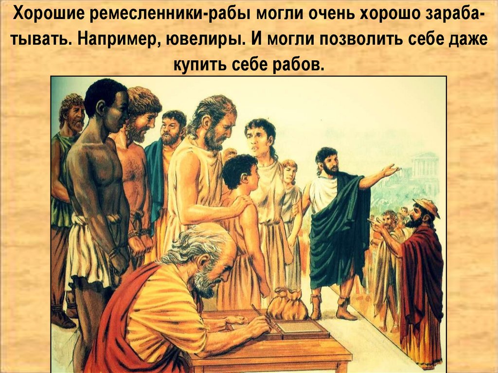 Хорошие ремесленники-рабы могли очень хорошо зарабатывать. Например, ювелиры. И могли позволить себе дажекупить себе рабов.
