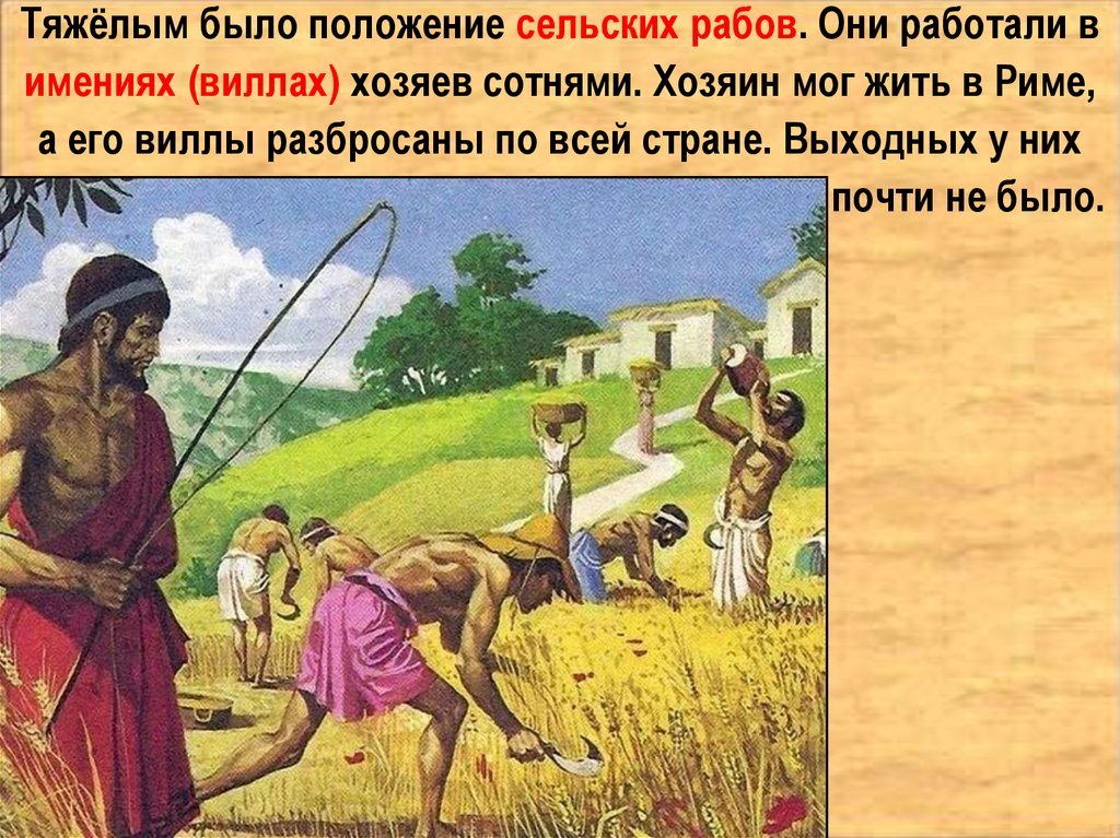 Тяжёлым было положение сельских рабов. Они работали вимениях (виллах) хозяев сотнями. Хозяин мог жить в Риме,