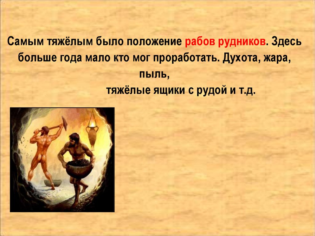 Самым тяжёлым было положение рабов рудников. Здесьбольше года мало кто мог проработать. Духота, жара,