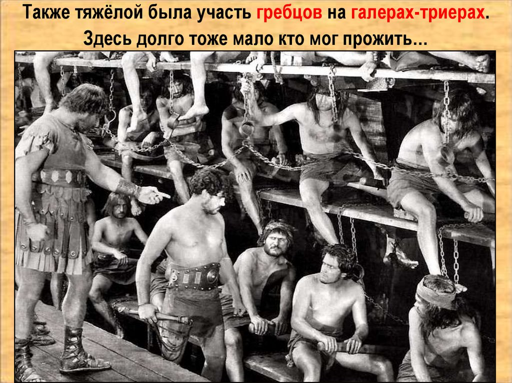 Также тяжёлой была участь гребцов на галерах-триерах.Здесь долго тоже мало кто мог прожить…