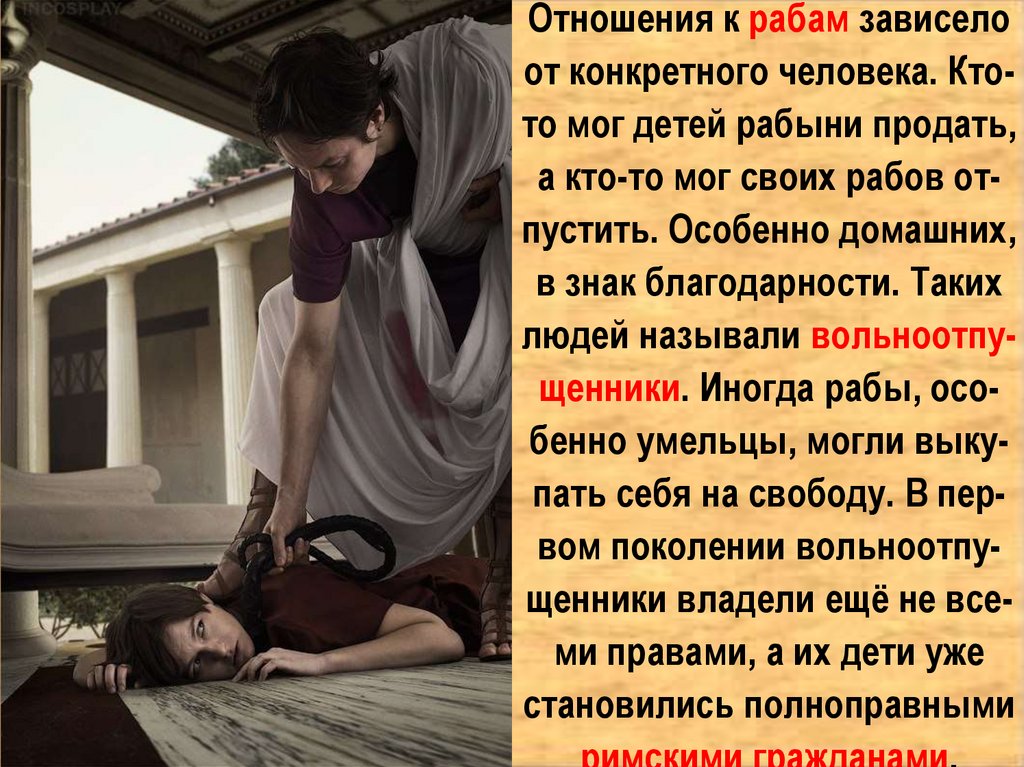людей называли вольноотпущенники. Иногда рабы, особенно умельцы, могли выкупать себя на свободу. В первом поколении вольноотпущенники владели ещё не всеми правами, а их дети уже