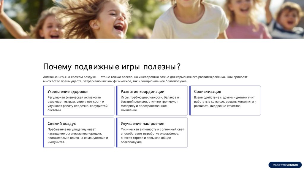 Почему подв ижны е игры полезны ?Активные игры на свежем воздухе — это не только весело, но и невероятно важно для гармоничного развития ребенка. Они приносят