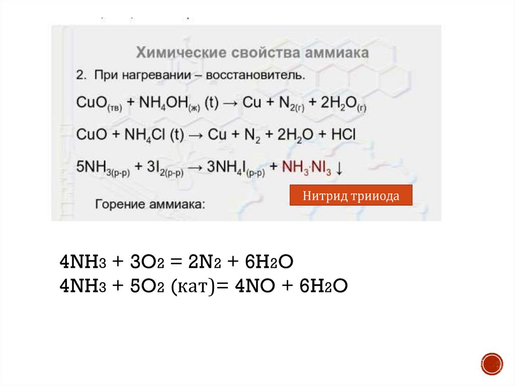 Нитрид трииода4NH3 + 3O2 = 2N2 + 6H2O