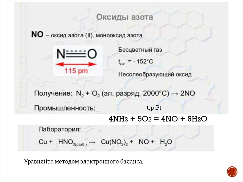 4NH3 + 5O2 (кат)= 4NO + 6H2O