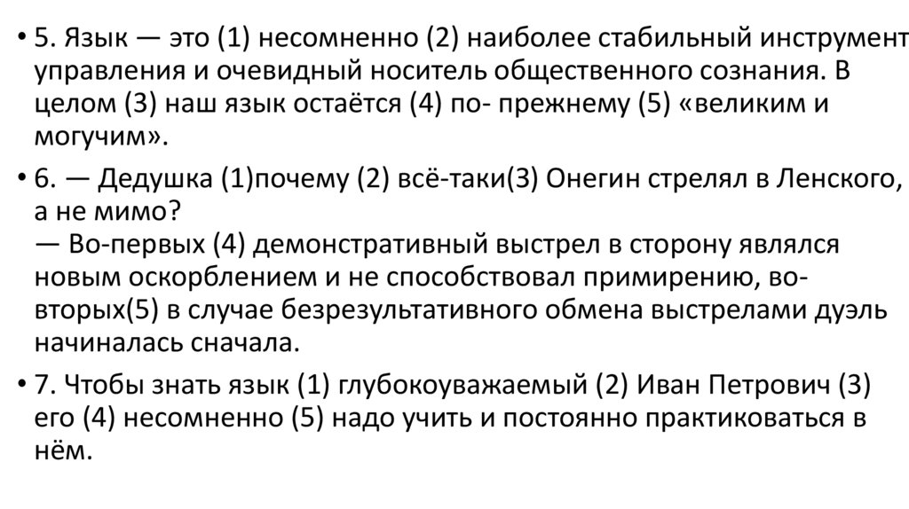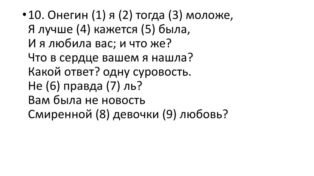 • 10. Онегин (1) я (2) тогда (3) моложе,Я лучше (4) кажется (5) была,