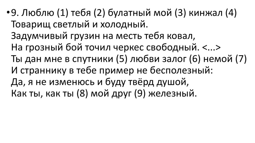 • 9. Люблю (1) тебя (2) булатный мой (3) кинжал (4)Товарищ светлый и холодный.