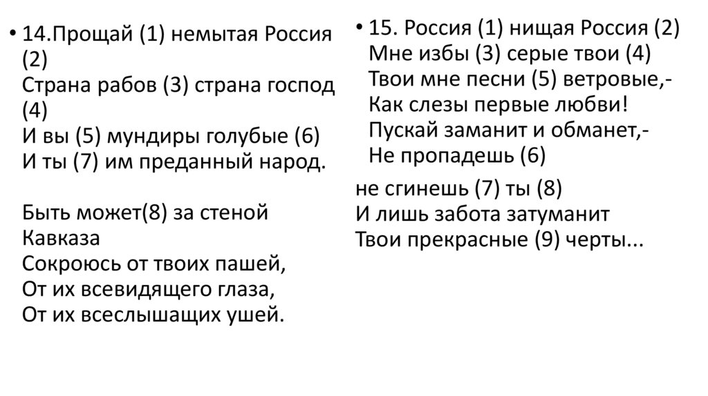 • 14.Прощай (1) немытая Россия • 15. Россия (1) нищая Россия (2)Мне избы (3) серые твои (4)