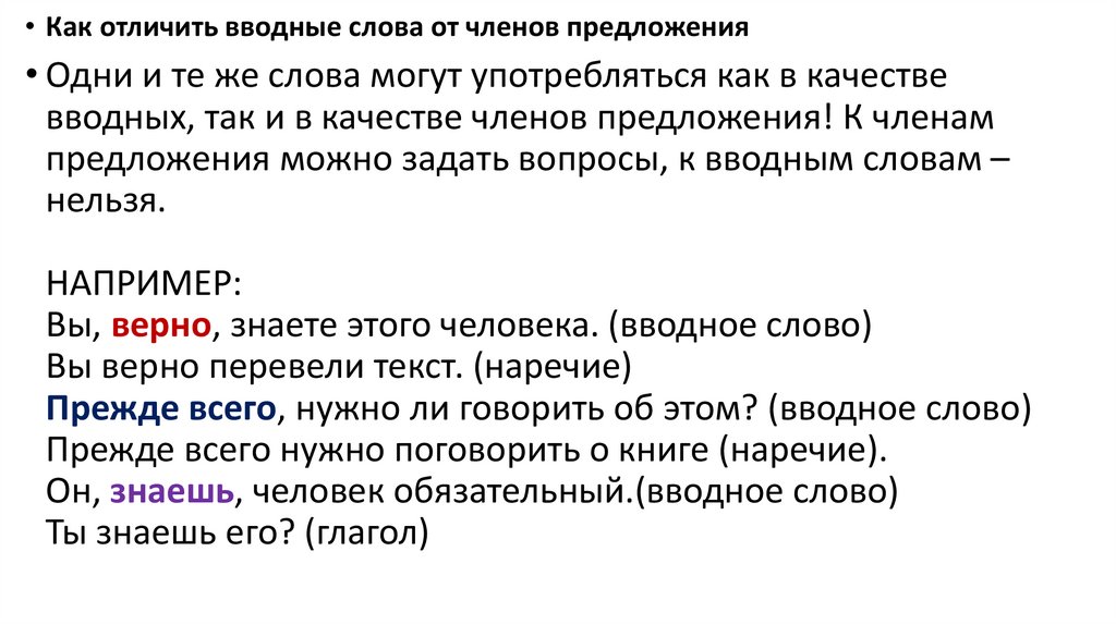 • Как отличить вводные слова от членов предложения• Одни и те же слова могут употребляться как в качестве