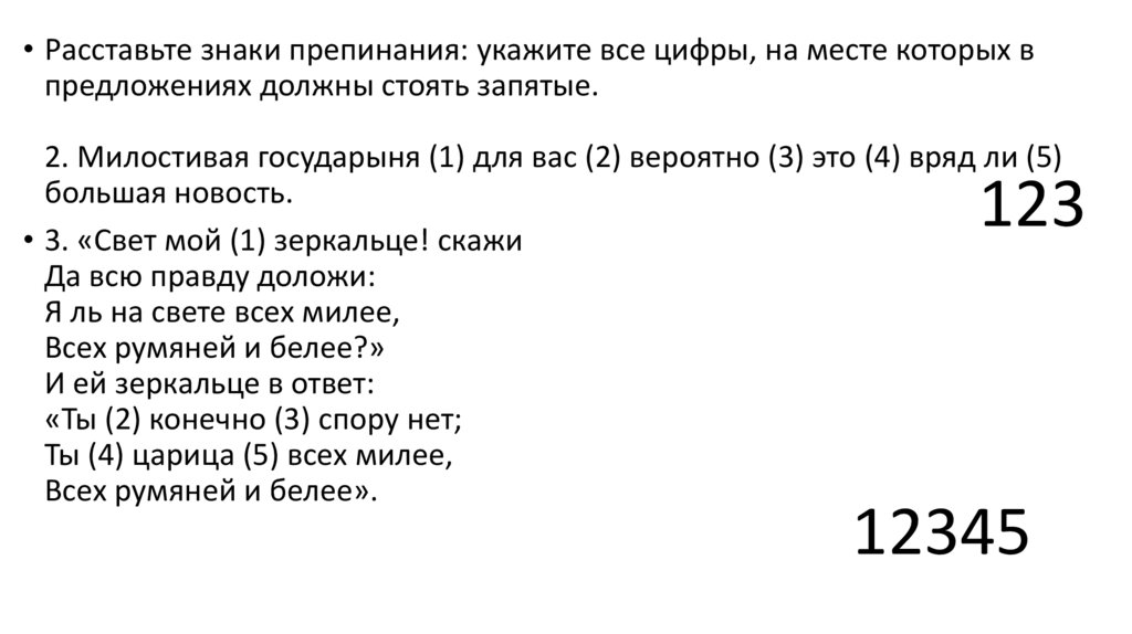 • Расставьте знаки препинания: укажите все цифры, на месте которых впредложениях должны стоять запятые.