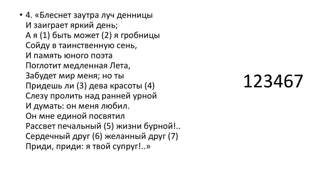 • 4. «Блеснет заутра луч денницыИ заиграет яркий день;