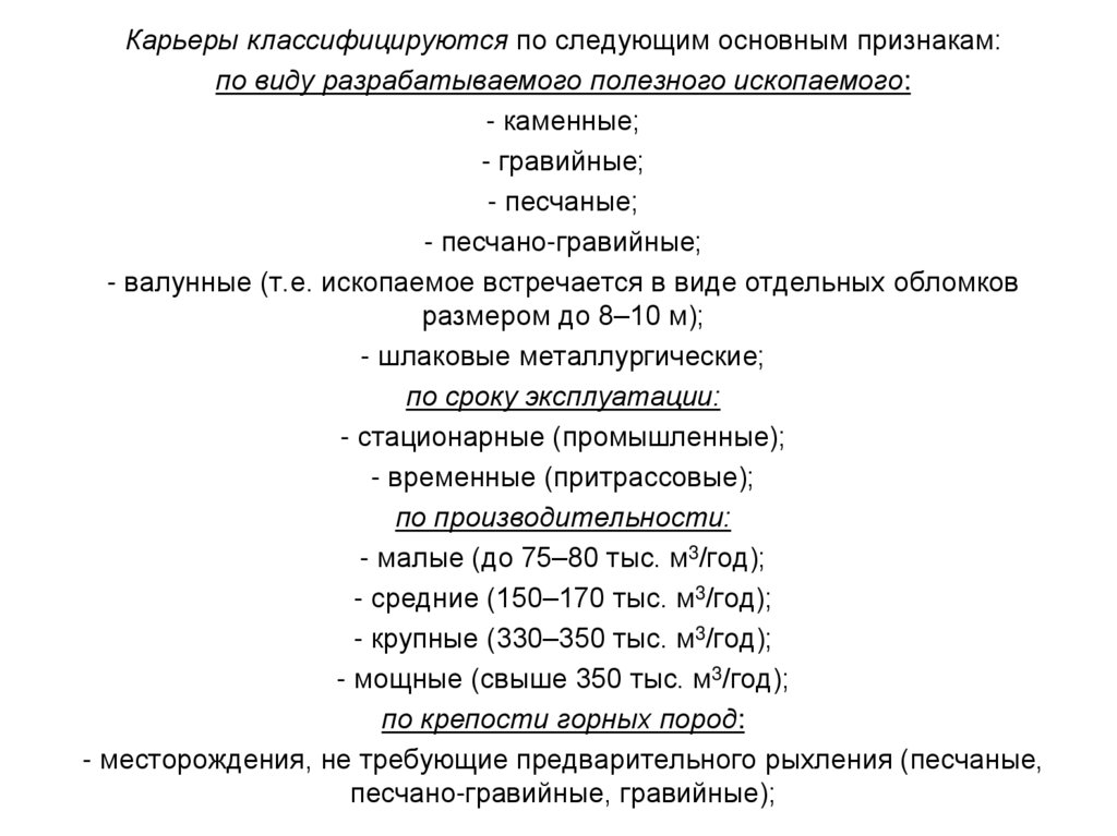 Карьеры классифицируются по следующим основным признакам:по виду разрабатываемого полезного ископаемого: