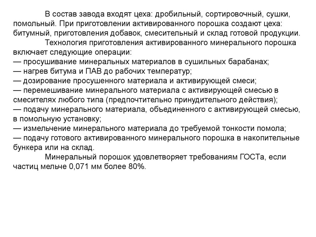 В состав завода входят цеха: дробильный, сортировочный, сушки,помольный. При приготовлении активированного порошка создают цеха: