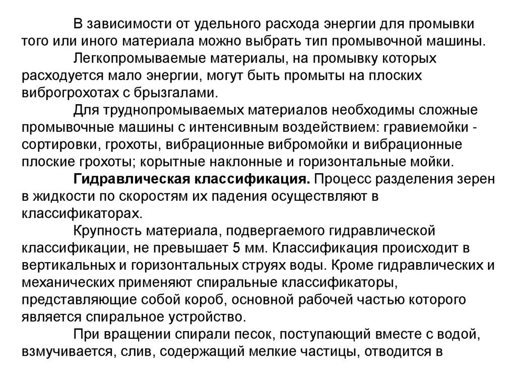 В зависимости от удельного расхода энергии для промывкитого или иного материала можно выбрать тип промывочной машины.