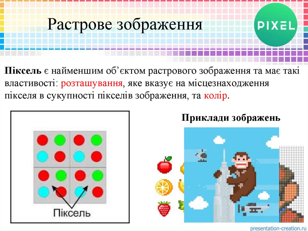 Растрове зображенняПіксель є найменшим об’єктом растрового зображення та має такі