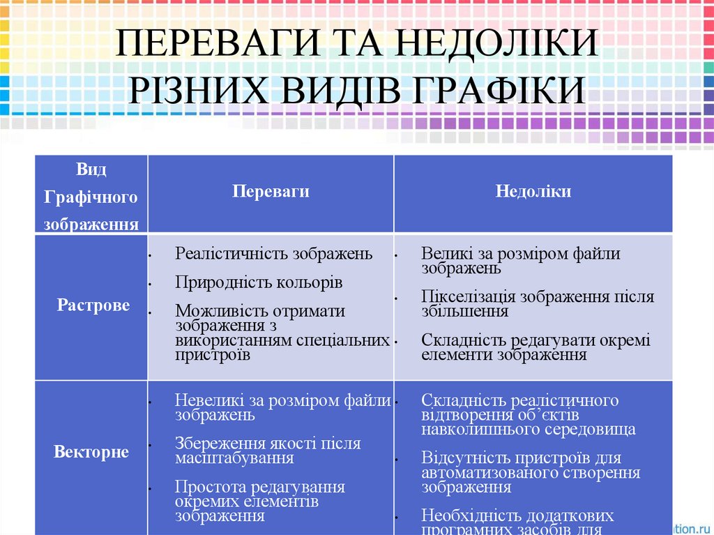 ПЕРЕВАГИ ТА НЕДОЛІКИРІЗНИХ ВИДІВ ГРАФІКИ
