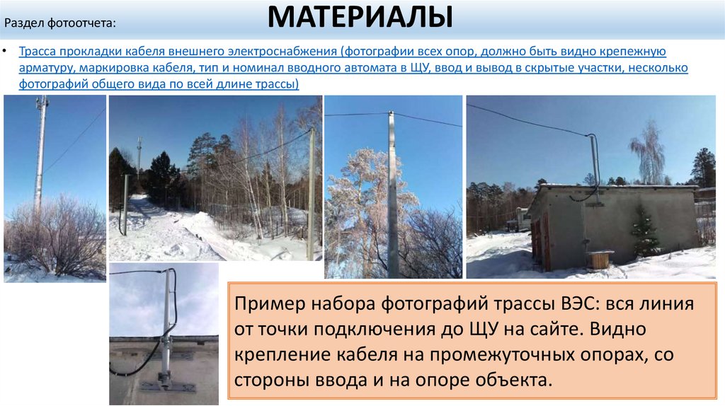 • Трасса прокладки кабеля внешнего электроснабжения (фотографии всех опор, должно быть видно крепежную