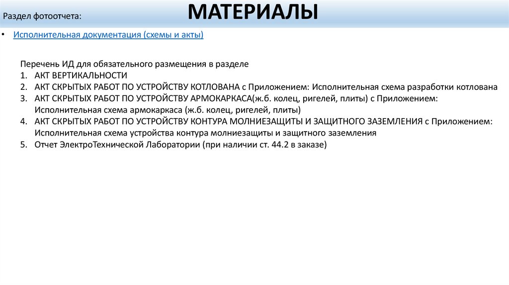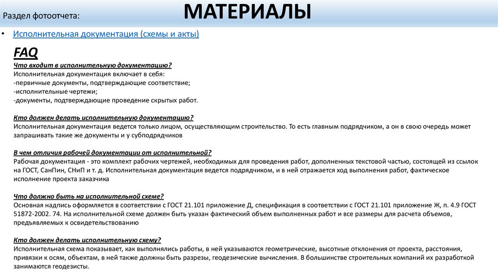 на ГОСТ, СанПин, СНиП и т. д. Исполнительная документация ведется подрядчиком, и в ней отражается ход выполнения работ, фактическое