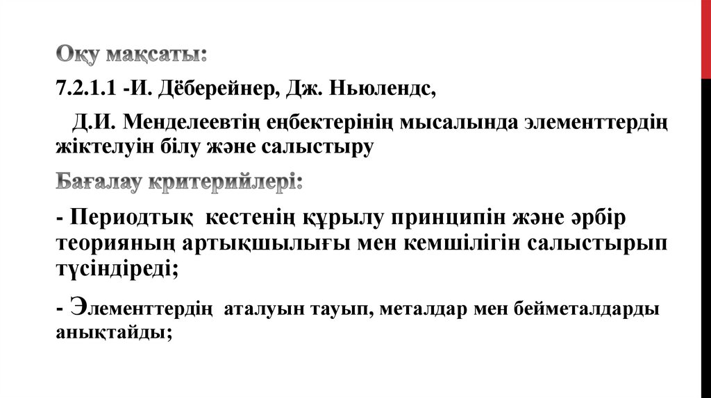 - И.В. Дёберейнер ғалымның элементтерді жүйелеу принципін сипаттайды;