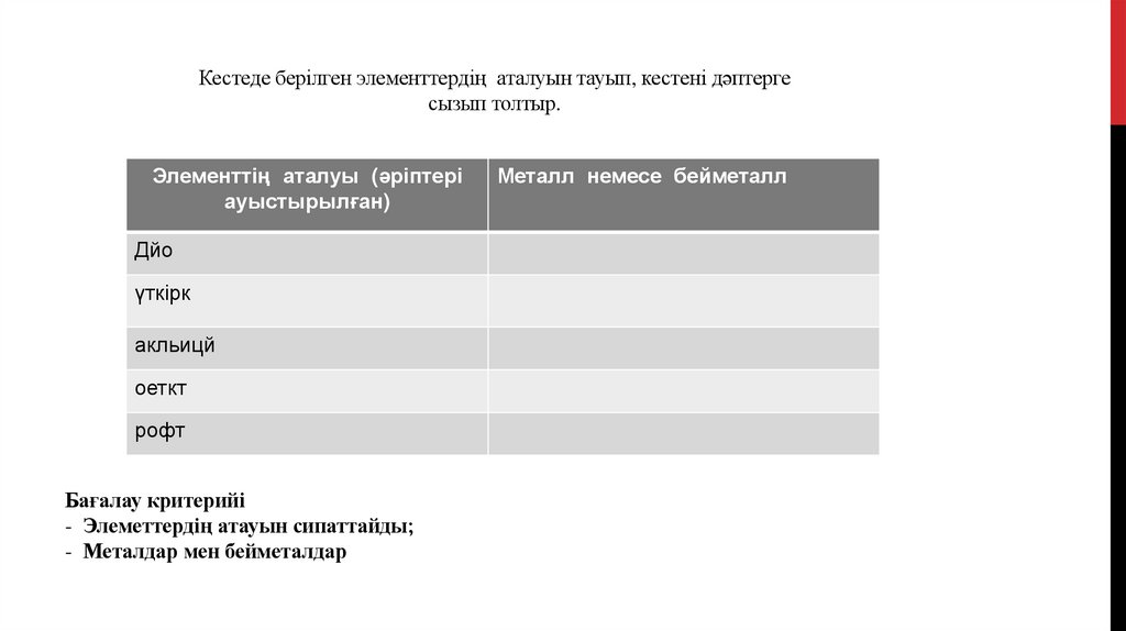 - Элементтердің аталуын тауып, металдар мен бейметалдарды