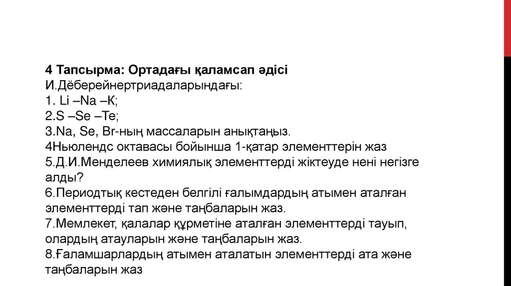 4 Тапсырма: Ортадағы қаламсап әдісіИ.Дёберейнертриадаларындағы: