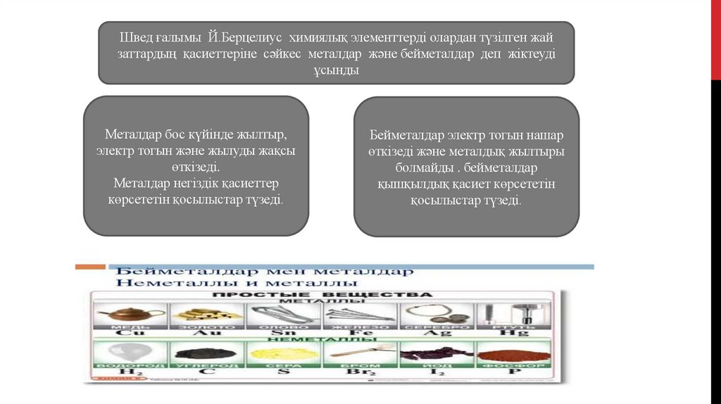 Швед ғалымы Й.Берцелиус химиялық элементтерді олардан түзілген жайзаттардың қасиеттеріне сәйкес металдар және бейметалдар деп жіктеуді