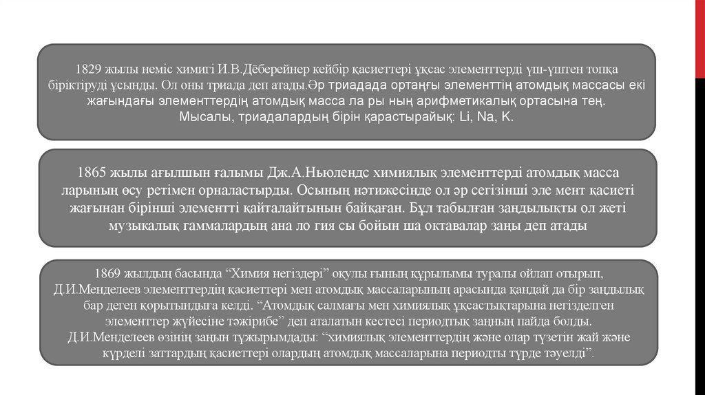 7.2.1.1 -И. Дёберейнер, Дж. Ньюлендс,Д.И. Менделеевтің еңбектерінің мысалында элементтердің