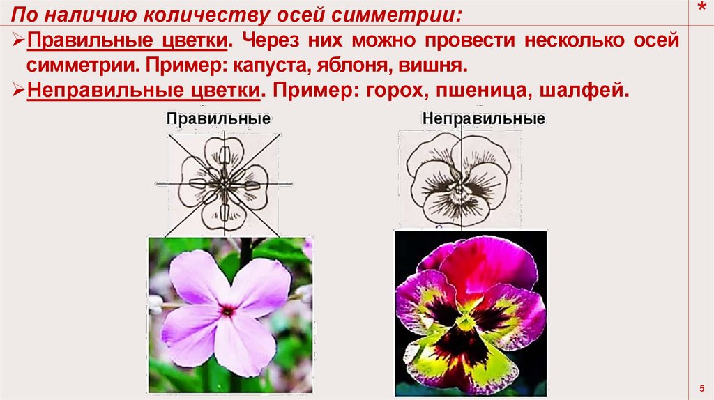 По наличию количеству осей симметрии:Правильные цветки. Через них можно провести несколько осей