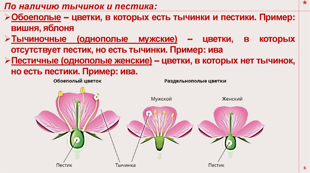 По наличию тычинок и пестика:Обоеполые – цветки, в которых есть тычинки и пестики. Пример:
