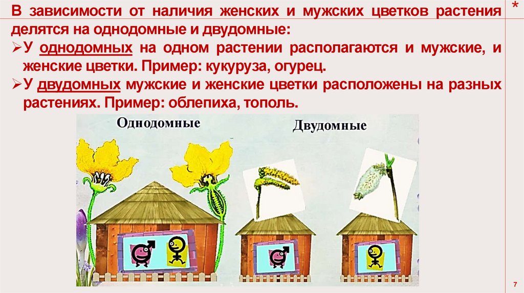В зависимости от наличия женских и мужских цветков растения *делятся на однодомные и двудомные: