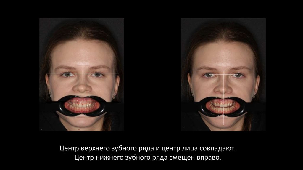 Центр верхнего зубного ряда и центр лица совпадают.Центр нижнего зубного ряда смещен вправо.
