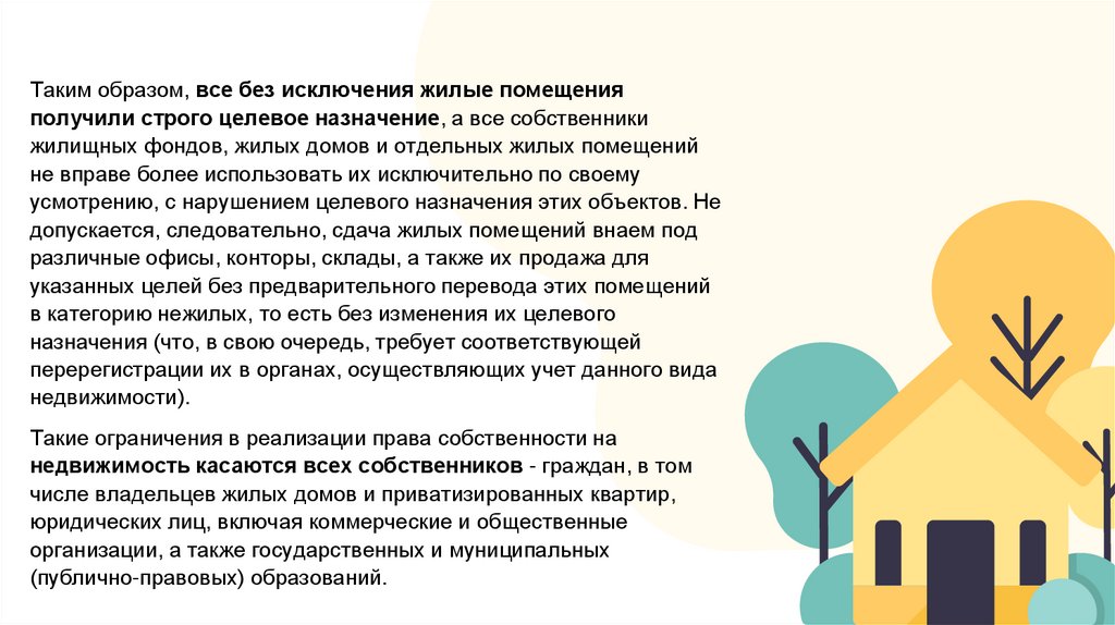 Таким образом, все без исключения жилые помещенияполучили строго целевое назначение, а все собственники