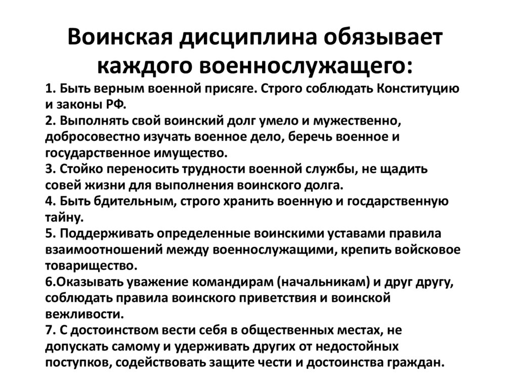 1. Быть верным военной присяге. Строго соблюдать Конституцию