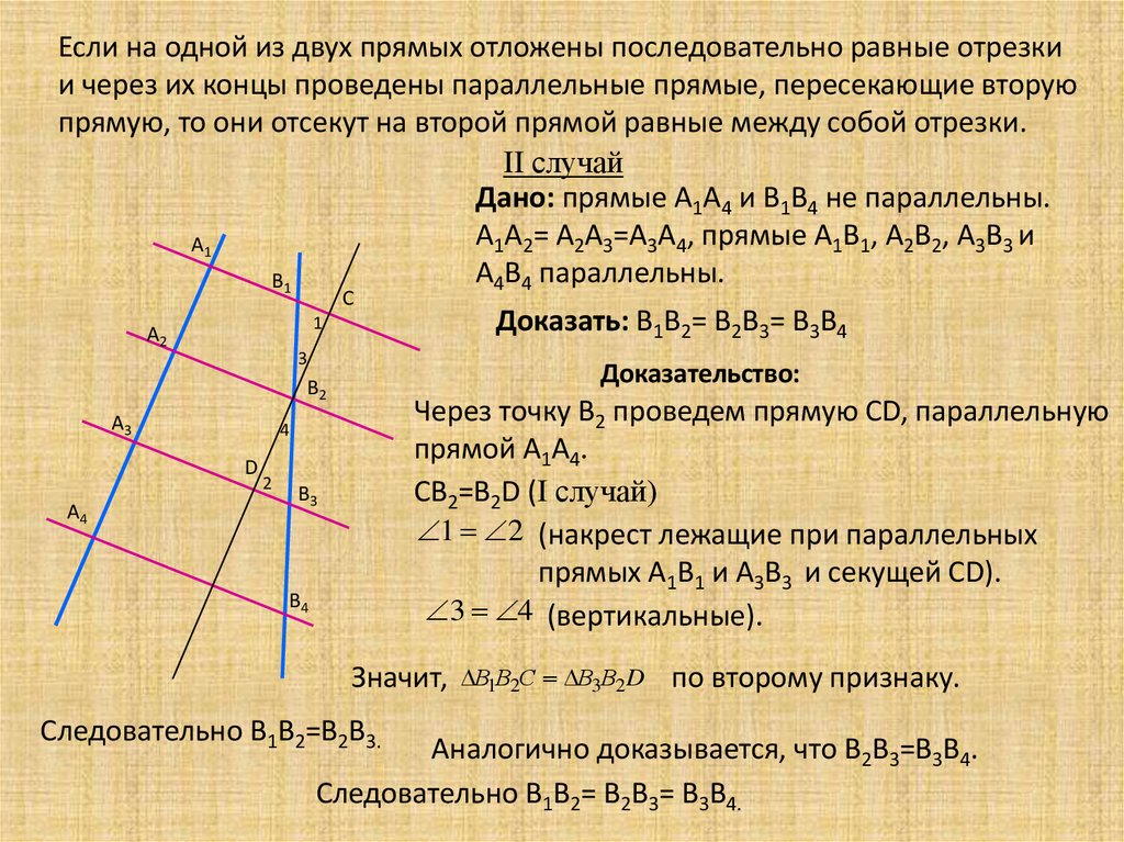 Если на одной из двух прямых отложены последовательно равные отрезкии через их концы проведены параллельные прямые, пересекающие вторую