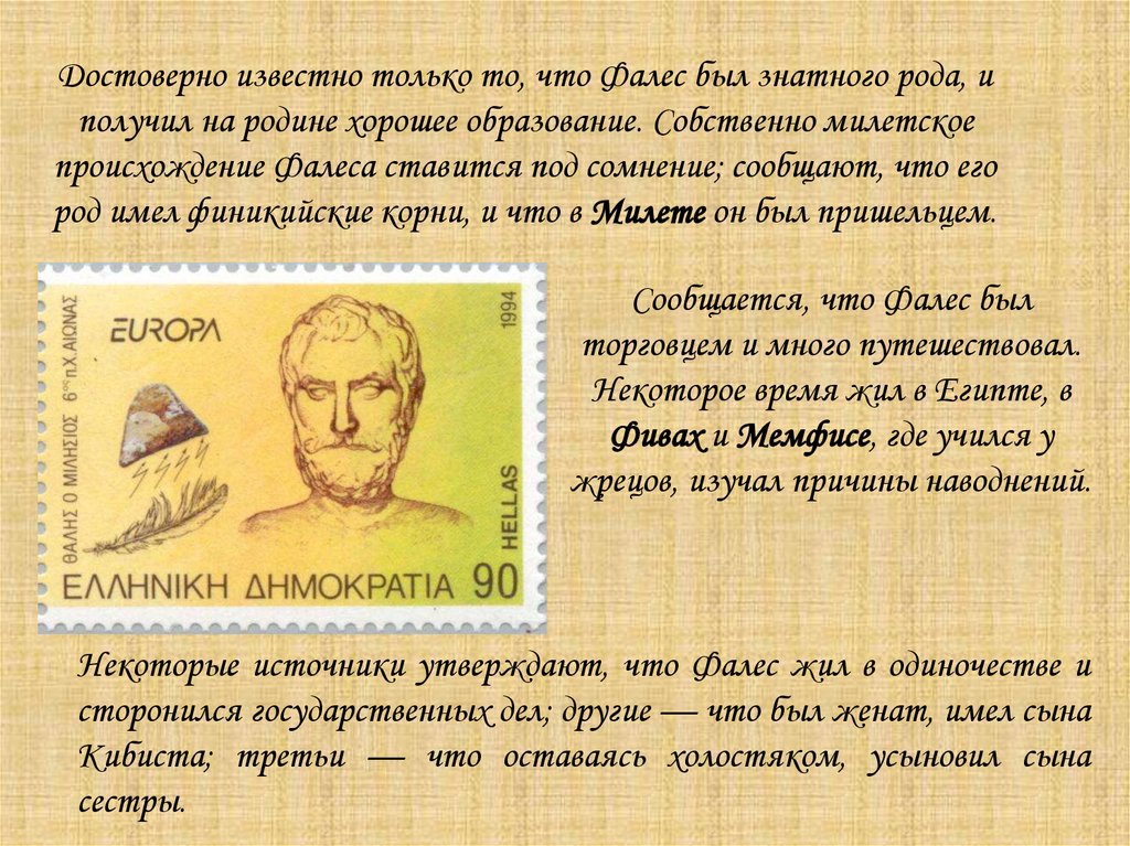Достоверно известно только то, что Фалес был знатного рода, иполучил на родине хорошее образование. Собственно милетское
