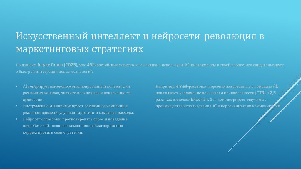 По данным Ingate Group (2025), уже 45% российских маркетологов активно используют AI-инструменты в своей работе, что свидетельствует
