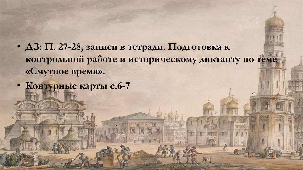 • ДЗ: П. 27-28, записи в тетради. Подготовка кконтрольной работе и историческому диктанту по теме