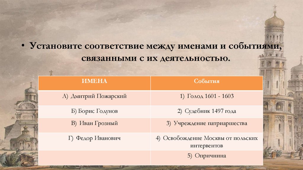 • Установите соответствие между именами и событиями,связанными с их деятельностью.