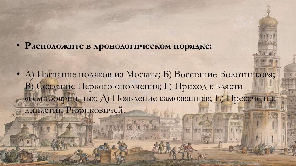 • Расположите в хронологическом порядке:• А) Изгнание поляков из Москвы; Б) Восстание Болотникова;