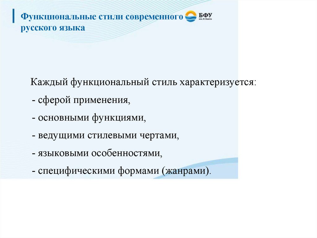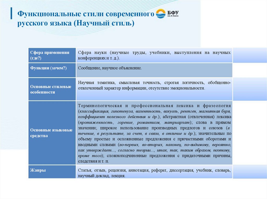 Научная тематика, смысловая точность, строгая логичность, обобщенноотвлеченный характер информации, отсутствие эмоциональности.