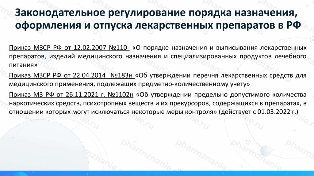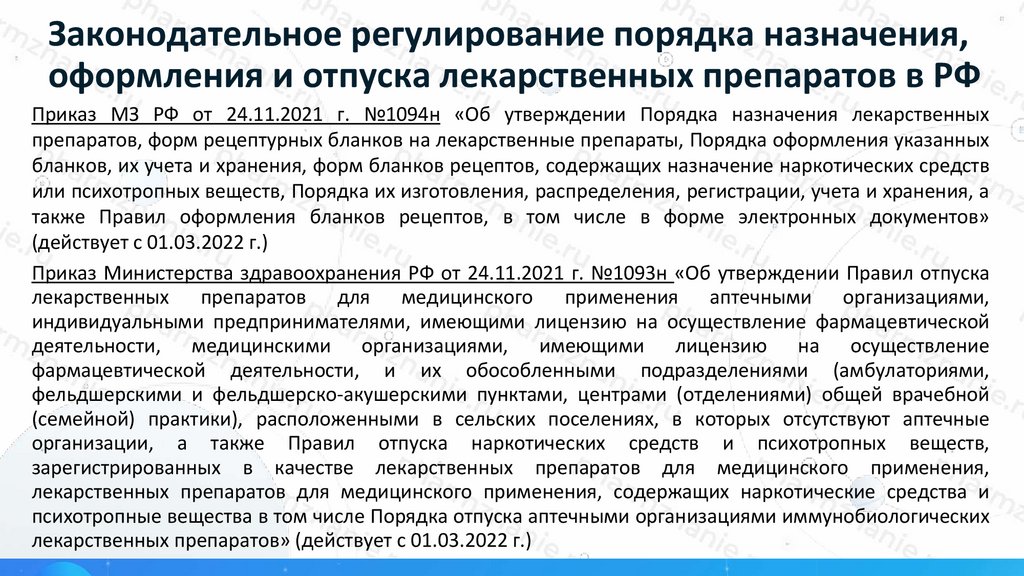 Законодательное регулирование порядка назначения,оформления и отпуска лекарственных препаратов в РФ
